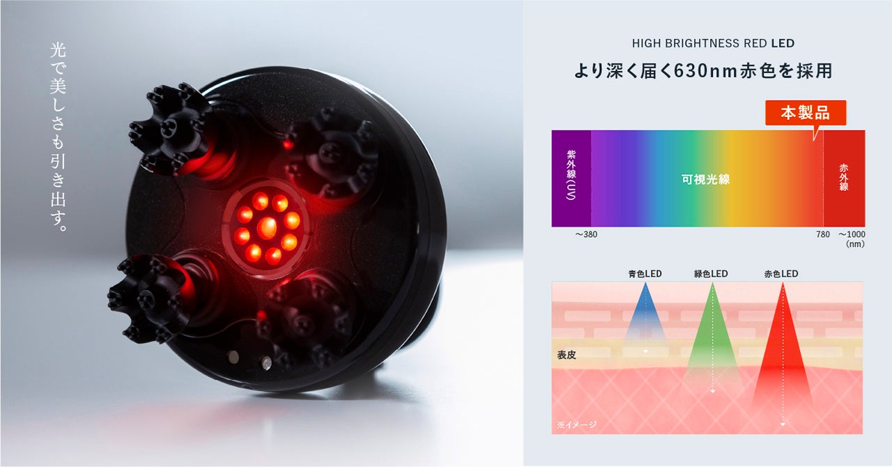 今回された光機能は、エステサロンで注目されている約630nmの波長を照射する「赤色LED」。肌に良いとされるこのLED光を、拡散・照射範囲を広くする独自構造を搭載し、美肌に特に有効な波長をまんべんなく肌に届け、理想の美肌へと導きます。