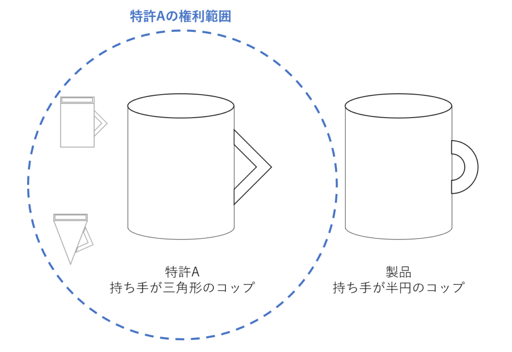 【特許A】持ち手が三角形のコップという特許があるとします。この時、コップの本体形状は関係なく(四角柱でも三角錐でもよい)、持ち手が三角形であればその権利範囲に含まれます。