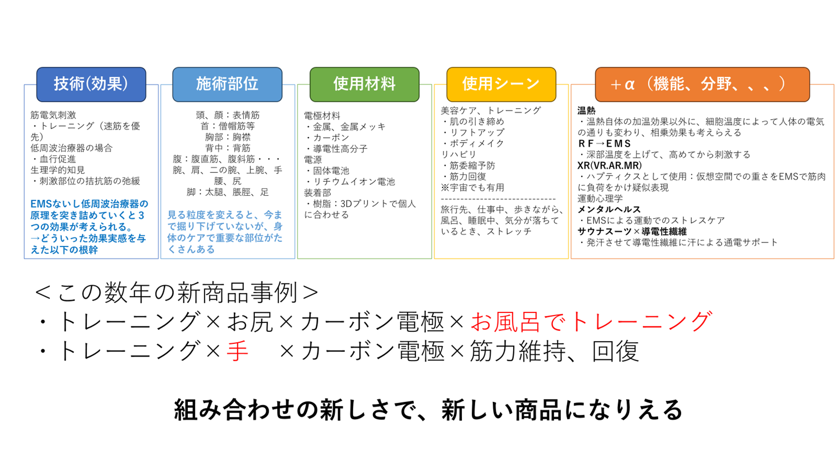 例えば、筋肉の電気刺激が低周波治療器からEMSとしてのトレーニング文脈に変化したように、製品の使用目的や意味を変えることで新しい商品コンセプトが生まれる可能性があります。