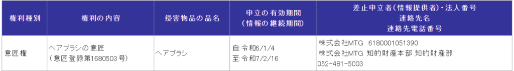 税関には、MTG社が登録している意匠権によって、対応を行うことが可能となっています。