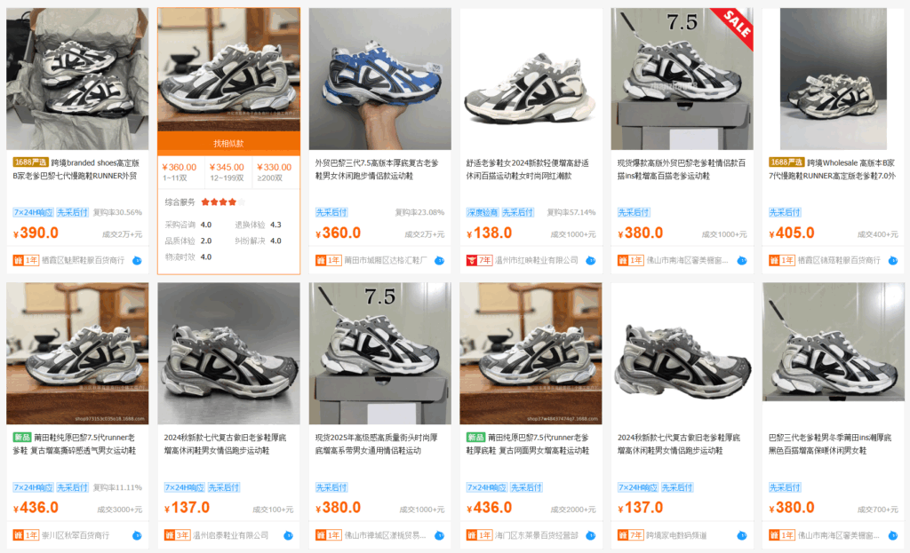 画像の中には、Balenciagaロゴが加工で消されているものや、公式に存在しない配色・加工のバリエーションが見られ、模倣品業者の関与が疑われます。