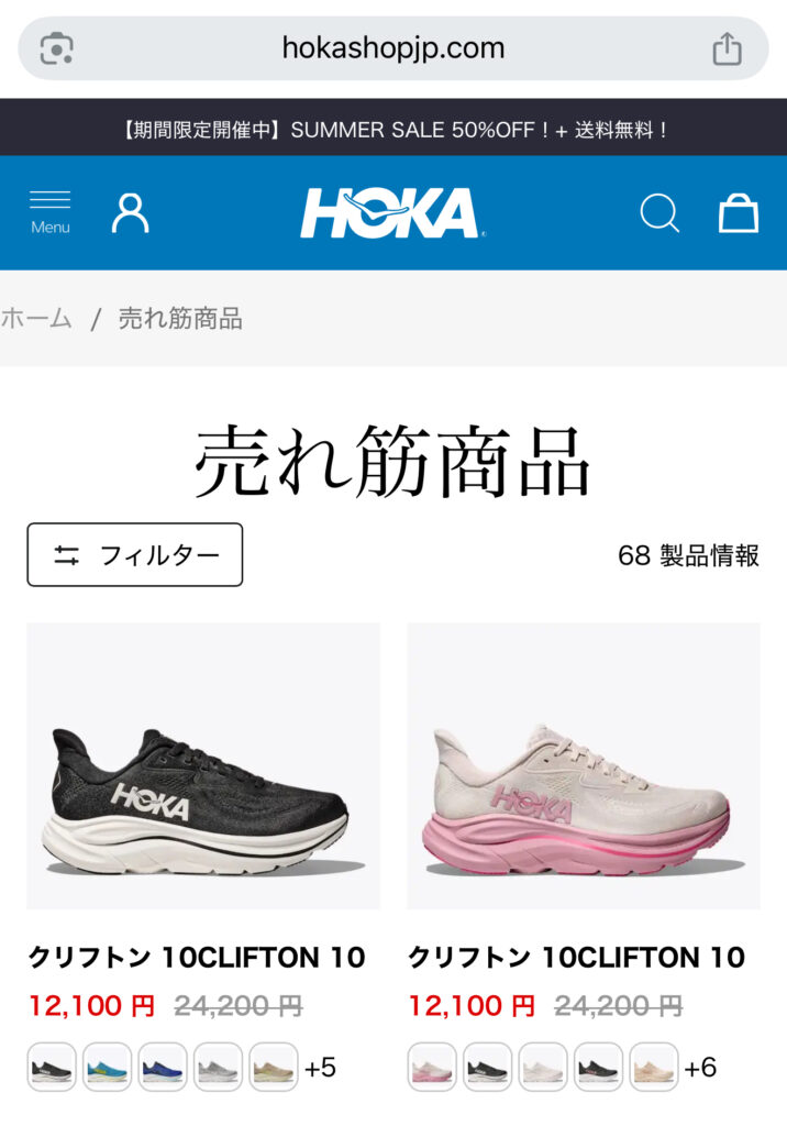 https://www.hoka.com/jp。似た綴りや別ドメインに注意。 - 価格:常時50〜90%OFFなど極端な恒常値引きは警戒。