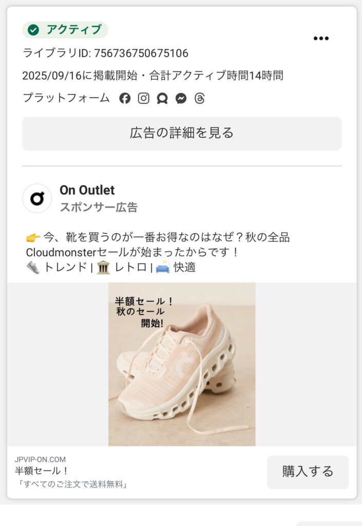 近年、スイス発の人気ランニングブランド On(オン) を狙った詐欺サイトが急増しています。特にMeta(Facebook・Instagram)の広告を通じて「半額セール」「アウトレット」といった魅力的な文言で消費者を偽サイトに誘導し、購入トラブルが発生しているケースが確認されています。