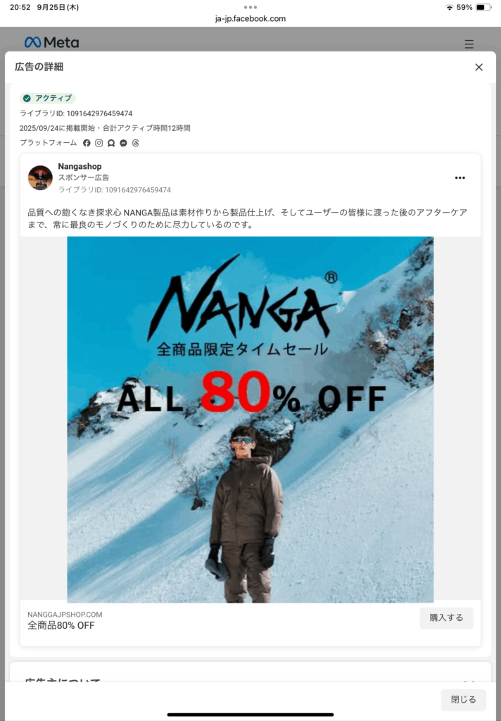 最近、NANGA(公式ドメイン:nanga.jp)を装った広告が Facebook / Instagram 上に表示され、ユーザーを別ドメインへ誘導する事例が確認されました。誘導先のサイト(例:nanggajpshop.com)は登録が直近であり、公式のドメイン所有者情報や運営情報と一致しないため、偽サイトまたは詐欺の疑いが高い