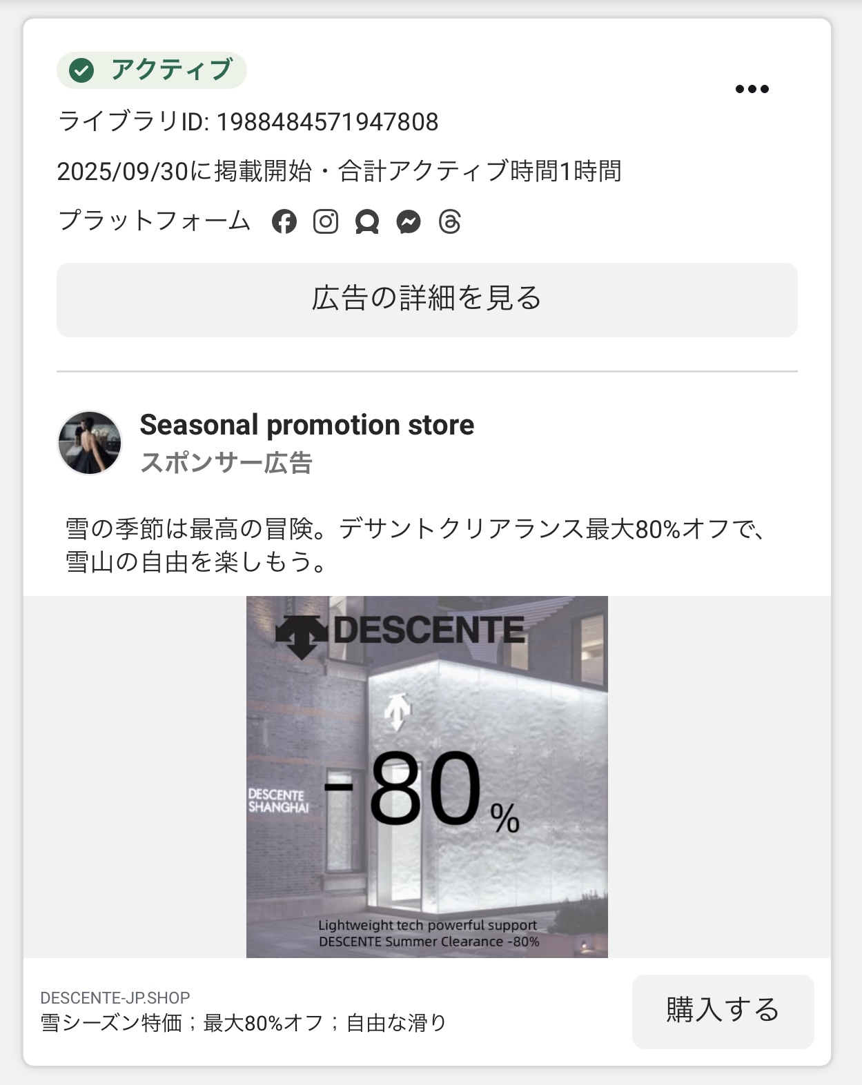 👉 実際の広告では、FacebookやInstagramに「DESCENTE Clearance -80%」などと表示され、購入ページへ誘導されていました。