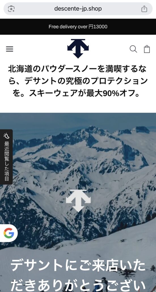 実際に確認された事例として、SNS広告から「descente-jp.shop」というサイトへ誘導するケースがあります。